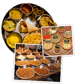 Kun je geen keuze maken uit de vele gerechten die op de menukaart staan, probeer dan eens thali. Dit is een bord met daarop kleine schaaltjes met diverse groenten, dahl (linzen), curd (yoghurt), chutney’s, papadum en daarbij rijst en chapati (plat brood). Met deze complete maaltijd maak je kennis met de gerechten van de streek. In Rajasthan vind je op een thali minder groenten in verband met de droogte, maar weer meer gerechten met granen en melkproducten. In het zuiden gebruikt men veel kokos en vis en wordt thali vaak geserveerd op een bananenblad.