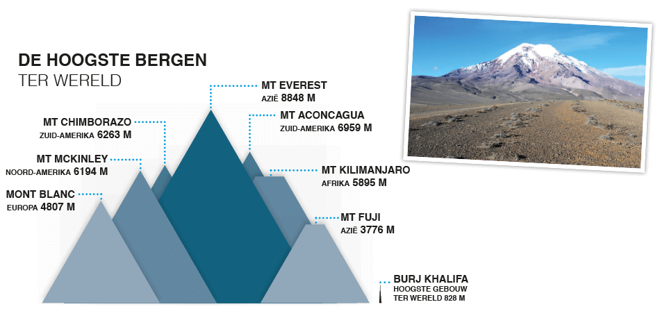 De vraag is simpel genoeg: wat is de hoogste berg op aarde? Ieder schoolkind weet het antwoord, als hij of zij een beetje heeft opgelet bij de aardrijkskundelessen: Mount Everest, officieel 8848 meter boven zeeniveau. Maar stel de vraag in Ecuador en je krijgt een heel ander antwoord. ‘El Chimborazo’, de trots van het land, is het hoogste punt ter wereld. Ook al is die slechts 6263,47 meter boven zeeniveau. En geloof het of niet: ze hebben een punt.
