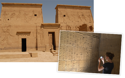 Met een felucca kun je naar de Philae-tempel varen bij de stad Aswan. Een tempel met prachtige hiërogliefen, het schrift dat rond 3100 v.Chr. is ontstaan. De geschiedenis van het land is heel bijzonder. Deze hiërogliefen bijvoorbeeld zijn duizenden jaren geleden uitgehakt.