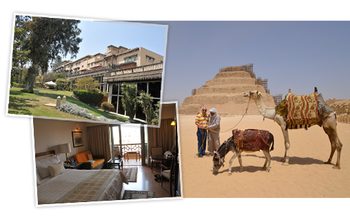 Aan het begin van de reis verbleven we in Cairo in het prachtige Mena House hotel met uitzicht op de piramides van Gizeh. Op een uurtje rijden van het hotel bezochten we de getrapte piramide van farao Djoser, het oudste en meest bekende stenen monument uit de geschiedenis, gebouwd rond 2700 v. Chr. Tijdens het poseren voor dit imponerende bouwwerk, kregen we bezoek. Voordat we het wisten waren we bijna eigenaar van een kameel. Eerst keken we bedenkelijk, maar uiteindelijk werd het een ‘nice picture with camel and pyramide’-moment. En de eigenaar van de kameel en de ezel had weer iets verdiend.