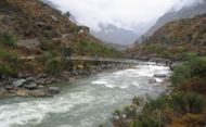 We lopen een stukje naar beneden langs de spoorlijn en van hier sluiten we aan in de rij voor een kantoortje, waar wordt nagegaan of je papieren kloppen (ook je paspoort). Na een kleine twintig minuten zijn we gescreend en gaat het echt beginnen. Om half twaalf lopen we over de hangbrug met onder ons in de diepte de woest stromende Urubamba. Het is direct al een klimmend parcours, maar heel goed te doen.