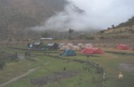 Tegen 17.00 uur komen we aan in Wayllabamba, ons eerste kamp. We zijn nu 250 meter geklommen en zitten nu op 3000 meter. Ongeveer 12 km hebben we langs de Cusichaca river gelopen. Niet ver maar wel een stevige wandeling. Goed te doen. Het is nog steeds regenachtig en nevelig. De tenten zijn al voor ons opgezet. Het zijn lage tweepersoons nylon tentjes. Je moet er echt induiken. Door de laaghangende bewolking is het al vrij vroeg donker en de zon is hier snel achter de grote kolossen verdwenen. De zaklampen worden tevoorschijn gehaald. Iedereen duikt even voor een uurtje de tent in. We willen uitgerust aan de warme maaltijd beginnen.