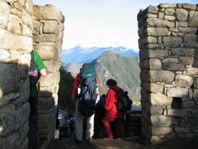 Om half vijf zit iedereen aan tafel, etend en kletsend over gisteravond en het laatste stukje wat ons nog staat te wachten. Het is nog ongeveer 6 km en daar zullen we zo’n anderhalf uur over doen. Dan is het zover, het laatste stuk. We vertrekken in het hartstikke donker, dus de zaklampen zijn nu zeer belangrijk. Het is wel redelijk vlak, maar de stenen liggen niet horizontaal. Het is een prachtig gezicht zo’n sliert van kabouters met hun lampjes over het bergpad te zien. We moeten nog een controlepost passeren, maar dat gaat vrij snel Heel langzaan wordt het steeds lichter en kunnen de zaklampen uit. Het is een mooie wandeling met achter de bergen de opkomende zon, die we niet kunnen zien, maar wel het steeds helder wordende licht. De bergkammen krijgen een rode gloed. We zijn er bijna met een licht opgewonden gevoel. Voordat we door de zonnepoort kunnen moeten we een bijna verticale trap bedwingen. Die is echt zwaar, nog één keer ademnood en een jagend hart en dan …….we zijn er ! We hebben het gehaald, de inca-trail is volbracht ! Het geeft een fantastisch gevoel.