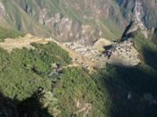 Wat een geweldig bouwwerk hier midden in de bergen. Kwart voor zeven, Machu Picchu ligt nog in de schaduw. We gaan door de zonnepoort en zoeken een plekje, waar we straks een schitterend uitzicht hebben op het schouwspel; de zon verlicht om 7.20 uur dan langzaam, meter voor meter het gehele complex. Heel indrukwekkend, je ziet op foto’s slechts een deel van deze ‘verborgen stad’ . Het is fenomenaal. We eten en drinken iets uit onze rugzakken en wachten hier rustig af en laten het geheel voor altijd op ons netvlies branden. Dan, om twintig over zeven wordt alles langzaam in ‘het licht’ gezet. Schitterend om dit mee te maken.