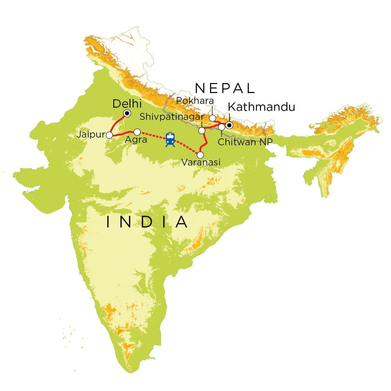 In India ontdek je de kleurrijke steden Delhi en Jaipur en lopen de koeien kriskras over straat. Natuurlijk bezoeken we de wereldberoemde Taj Mahal en de heilige stad aan de Ganges, Varanasi. We gaan op safari in Ranthambore nationaal park en komen hopelijk oog in oog te staan met tijgers. In Nepal kun je in de jungle neushoorns spotten. Het adembenemende landschap van diepe valleien en torenhoge bergen vormt een prachtig decor voor deze reis. In Kathmandu kun je naar hartenlust winkelen en dwalen door de middeleeuwse straatjes.