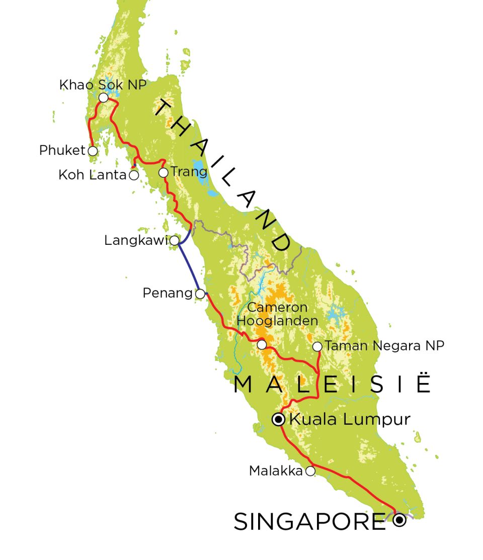 Deze afwisselende rondreis start nabij het futuristische Marina Bay gebied van Singapore. Vanaf het Skypark kijk je uit over de bruisende stad en imposante skyline. In Malakka beleef je de Oud Hollandse koloniale cultuur en in Kuala Lumpur kun je grenzeloos shoppen. Vervolgens reizen we door de rijke natuur van Maleisië en bezoeken we de regenwouden in Taman Negara en de theeplantages van de Cameron Hooglanden. We ontspannen op de tropische eilanden Penang, Langkawi en Koh Lanta, en we maken een avontuurlijke tocht door de jungle van Khao Sok waar je stijlvol kunt nagenieten van deze buitengewone reis.
