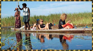 Vroeg op vandaag, we gaan naar de beroemde Okavangodelta. Dit mooie natuurgebied is ontstaan waar de Okavangorivier uitstroomt in de Kalahariwoestijn. Dat levert een interessant leefgebied op voor flora en fauna. In een kano van een uitgehakte boomstam, een mokoro, worden we behoedzaam naar onze kampeerplek gevaren. Doodstil genieten we van de prachtige vogels. Sommige reisgenoten hebben onderweg een krokodil het water in zien gaan. Op hun digitale camera kun je nog net de staart zien.